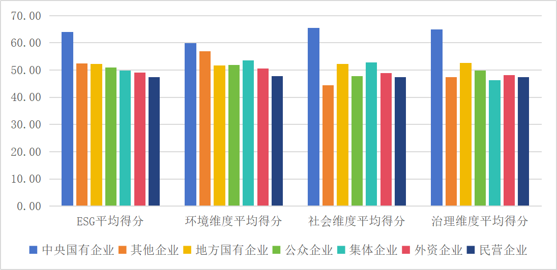 從企業(yè)屬性來(lái)看,中央國有企業(yè)的ESG得分持續領(lǐng)先,明顯優(yōu)于其他企業(yè)、地方國有企業(yè),展現出較強的可持續發(fā)展管理能力和治理規范水平。2024年,企業(yè)屬性ESG得分排序依次為中央國有企業(yè)、其他企業(yè)、地方國有企業(yè)、公眾企業(yè)、集體企業(yè)、外資企業(yè)及民營(yíng)企業(yè),較2023年順位略有調整,但整體變化不大,仍以中央國有企業(yè)作為國家戰略實(shí)施的主力軍。在國資委社會(huì )責任政策的引導與嚴格的監管要求下,中央國有企業(yè)在綠色低碳發(fā)展、風(fēng)險管理、信息披露等方面制度基礎扎實(shí),治理結構完善,整體能力水平較高,成為引領(lǐng)ESG高質(zhì)量發(fā)展的重要力量。相比之下,民營(yíng)企業(yè)在ESG體系建設方面起步相對較晚,受制于資源投入能力有限、信息披露意識較弱及治理機制仍需進(jìn)一步完善等因素,整體ESG表現仍處于相對滯后階段。