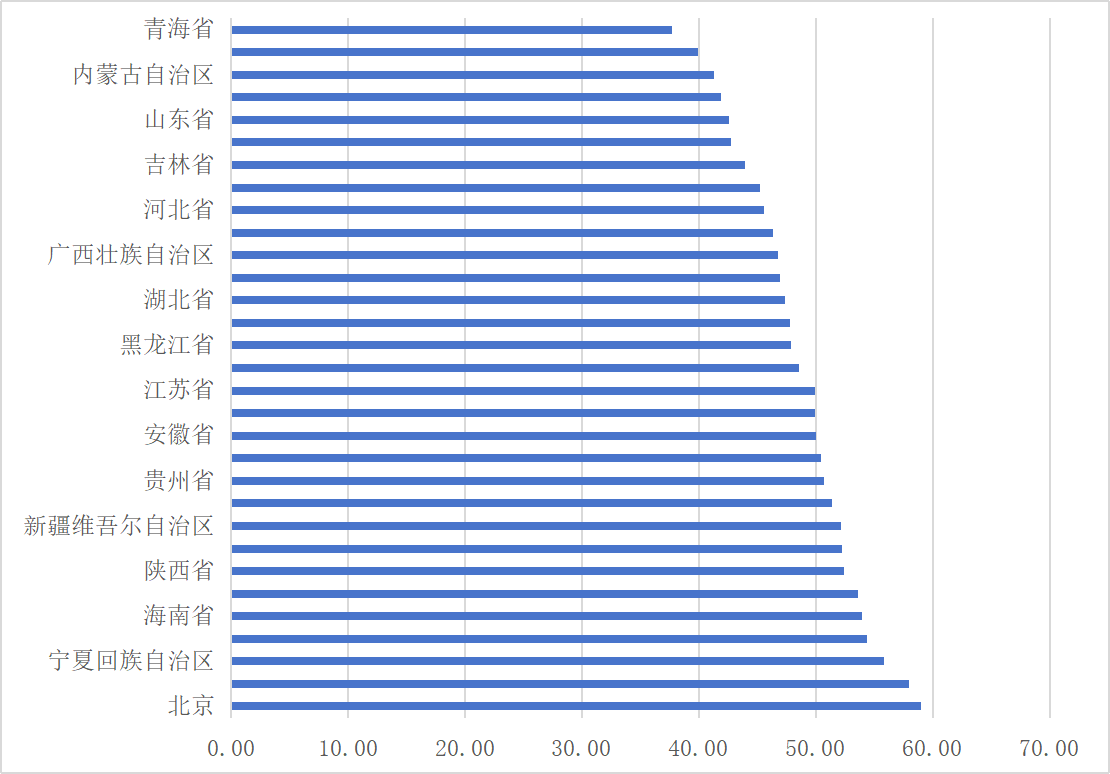 從區域分布來(lái)看,不同地區上市公司ESG表現存在明顯差異,區域經(jīng)濟發(fā)展水平、產(chǎn)業(yè)結構、政策支持力度與企業(yè)治理效能等因素在一定程度上影響了企業(yè)ESG治理能力與實(shí)踐水平。2024年度,北京(59.03)、天津(57.96)、寧夏(55.84)、上海(54.34)、海南(53.93)地區上市公司ESG得分排在前五,隨后為云南(53.63)、陜西(52.39)、福建(52.24)、新疆(52.14)及重慶(51.42)地區位居前十。相較于2023年北京、上海、海南、天津、重慶的排名有所變化,主要原因可能在于地方政府對可持續發(fā)展的重視提升,制定發(fā)布系列政策引導推動(dòng)當地企業(yè)ESG整體實(shí)踐提升。相比之下,浙江(47.81)、江蘇(49.92)、廣東(49.94)等東部經(jīng)濟大省的ESG得分處于中游偏下水平,盡管這些地區經(jīng)濟發(fā)展態(tài)勢強勁,上市公司數量眾多,但區域內中小市值企業(yè)占比較高,在ESG管理體系建設、信息披露能力提升等方面普遍面臨成本約束、技術(shù)壁壘和專(zhuān)業(yè)能力不足等實(shí)際困難,導致整體ESG表現相對滯后,在一定程度上拉低了區域平均得分水平。青海、甘肅、內蒙古、西藏等西部地區則處于末端位置,ESG整體表現相對薄弱。由于受限于資源條件、信息披露經(jīng)驗和專(zhuān)業(yè)能力積累,ESG體系建設仍在逐步探索過(guò)程中。