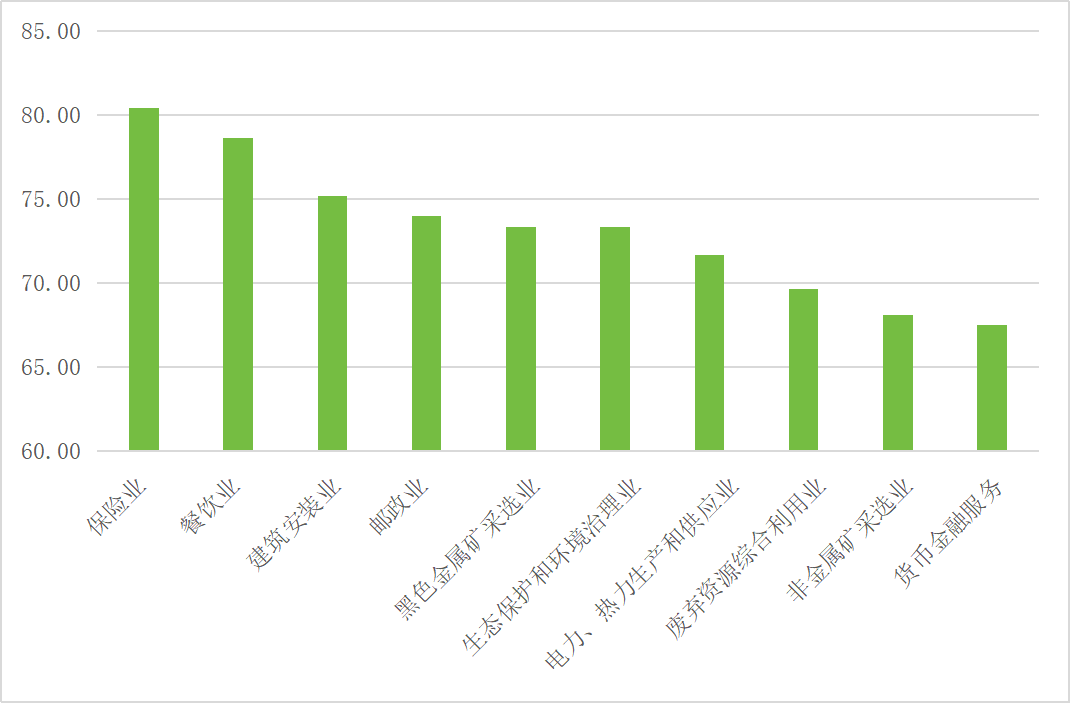 就行業(yè)ESG表現來(lái)看,保險業(yè)、餐飲業(yè)、建筑安裝業(yè)的平均得分分別為80.43分、78.60分和75.18分,位居行業(yè)排行的前三名,顯示出較強的可持續發(fā)展管理能力。郵政業(yè)、黑色金屬礦采選業(yè)和生態(tài)保護和環(huán)境治理業(yè)分別以74.02分、73.36分和73.33分位居其后。保險業(yè)本身具有長(cháng)期性與穩定性特點(diǎn),在行業(yè)屬性上與可持續發(fā)展理念深度契合,特別是近年來(lái)我國政策與監管要求持續推動(dòng)保險業(yè)大力發(fā)展綠色金融,加大對綠色、低碳、循環(huán)經(jīng)濟的支持,防范環(huán)境、社會(huì )和治理風(fēng)險,提升自身的環(huán)境、社會(huì )和治理表現。因此,保險行業(yè)上市公司在ESG的三個(gè)維度均表現優(yōu)秀且較為穩定,特別是在ESG風(fēng)險識別、信息披露合規性及內部控制制度方面相對成熟,展現出較高的ESG治理水平。餐飲業(yè)則作為典型的服務(wù)行業(yè),與居民生活質(zhì)量和公共衛生安全密切相關(guān),社會(huì )責任屬性顯著(zhù),其在社會(huì )維度得分表現尤為突出。同時(shí),隨著(zhù)碳中和目標的深入推進(jìn),越來(lái)越多餐飲企業(yè)開(kāi)始主動(dòng)參與綠色供應鏈建設、節能降耗與環(huán)保包裝等轉型實(shí)踐,并逐步響應聯(lián)合國可持續發(fā)展目標(SDGs),推動(dòng)企業(yè)行為與可持續發(fā)展進(jìn)一步融合,從而實(shí)現行業(yè)整體ESG表現提升。建筑安裝業(yè)作為基礎設施建設的核心板塊,也是眾多產(chǎn)業(yè)鏈中的重要環(huán)節,其ESG表現的提升不僅受到了政策端的持續驅動(dòng),如建筑領(lǐng)域節能降碳、建設項目碳排放等監管要求,也在市場(chǎng)端面臨更加嚴格的綠色招標、低碳工程評價(jià)與生態(tài)績(jì)效考核的現實(shí)需求。為實(shí)現“雙碳”與綠色發(fā)展目標,建筑安裝業(yè)上市公司在綠色工程設計、綠色建筑材料應用、綠色施工技術(shù)創(chuàng )新以及綠色產(chǎn)品研發(fā)等多個(gè)方面持續投入,不僅增強了項目的環(huán)境友好性與資源利用效率,也推動(dòng)了員工健康、安全施工、社區關(guān)系等社會(huì )議題的積極應對,顯著(zhù)改善了行業(yè)在環(huán)境與社會(huì )兩個(gè)維度的綜合得分,進(jìn)而帶動(dòng)行業(yè)ESG整體表現加速提升。