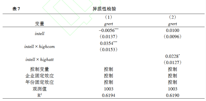 政府注意力是政策制定的重要驅動(dòng)因素(Jones,1994)。由于政府的注意力是有限的,只有當政府集中關(guān)注環(huán)境保護時(shí),才更有可能?chē)@環(huán)境問(wèn)題制定并實(shí)施相關(guān)政策。而政策的變化又決定了企業(yè)的行為,企業(yè)必須對政策變化做出及時(shí)的反應以抓住商機(Porta et al.,1998)。據此本文推測,當企業(yè)所在地級市的政府高度關(guān)注環(huán)境問(wèn)題時(shí),智能制造對綠色轉型的推動(dòng)作用更為顯著(zhù)。本文借鑒陳詩(shī)一和陳登科(2018)的做法,根據地級市政府工作報告中環(huán)境關(guān)鍵詞詞頻的中位數構造高環(huán)境關(guān)注度虛擬變量(highatt),并將highatt與intell的交互項加入基準回歸。表7第(2)列結果顯示,智能制造對企業(yè)綠色轉型的推動(dòng)作用主要發(fā)生在政府環(huán)境關(guān)注度高的城市。