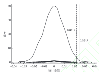 為進(jìn)一步保證本文估計結果的可靠性,本文隨機分配入選智能制造試點(diǎn)示范行動(dòng)的企業(yè)和入選年份。圖4繪制了1000次重復隨機抽樣的估計系數和p值分布,其中估計系數的均值為-0.0002,中位數為0.0001,均接近于0,且估計系數的真實(shí)值(0.0245)大于1000次隨機抽樣估計值的95%分位數(0.0219),說(shuō)明入選對企業(yè)綠色轉型的影響不是由隨機因素造成的,基準回歸的估計結果不因潛在遺漏變量而產(chǎn)生偏差。