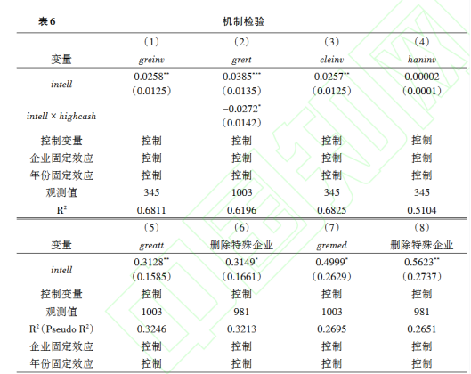 表6第(1)列結果顯示,智能制造對企業(yè)增加綠色投資具有顯著(zhù)正向影響。從表6第(2)列可以看到,intell×highcash的估計系數顯著(zhù)為負,表明對于初始現金持有不足的企業(yè),智能制造對推動(dòng)企業(yè)綠色轉型的作用更大。智能制造既有助于企業(yè)節約生產(chǎn)成本、提高生產(chǎn)效率,進(jìn)而增加內源資金利得,又有助于企業(yè)獲得專(zhuān)項基金的補貼、優(yōu)化銀企關(guān)系、提高商業(yè)信用,進(jìn)而緩解外源資金約束,為企業(yè)(尤其是現金流薄弱的企業(yè))實(shí)現綠色轉型奠定充足的資金基礎(權小鋒和李闖,2022;尹洪英和李闖,2022;沈坤榮等,2023)。