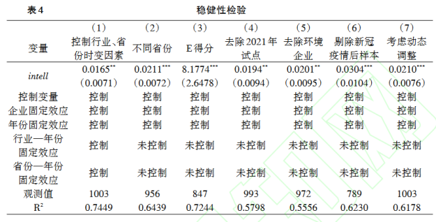 近年來(lái),中國圍繞綠色發(fā)展目標制定并實(shí)施了多項環(huán)境政策,既包括碳排放權交易試點(diǎn)政策、中央環(huán)保督察制度等地區試點(diǎn)政策,又包括《大氣污染防治法》《水污染行業(yè)防治法》及環(huán)保稅等行業(yè)重點(diǎn)政策。本文通過(guò)增加行業(yè)-年份固定效應和省份年份固定效應來(lái)控制上述政策的潛在影響,表4第(1)列顯示,智能制造依然顯著(zhù)促進(jìn)了企業(yè)綠色轉型。