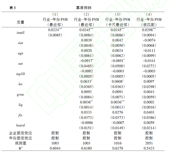 表3匯報了入選智能制造試點(diǎn)示范行動(dòng)對企業(yè)綠色轉型影響的回歸結果。第(1)列匯報了使用行業(yè)-年份PSM(1:3最鄰近匹配)匹配的回歸結果,可以看到intell的估計系數在1%水平上顯著(zhù)為正,說(shuō)明智能制造對企業(yè)綠色轉型具有顯著(zhù)的推動(dòng)作用。第(2)列在第(1)列的基礎上加入控制變量,結果顯示intell的估計系數為0.0245且在1%水平上顯著(zhù)為正,表明相比于未入選企業(yè),入選企業(yè)的綠色技術(shù)比例提高了0.0245,相比其均值,提高幅度約為39.14%。該結果證實(shí)了本文的研究假說(shuō)1,即實(shí)施智能制造有助于促進(jìn)企業(yè)技術(shù)向綠色方向轉型。