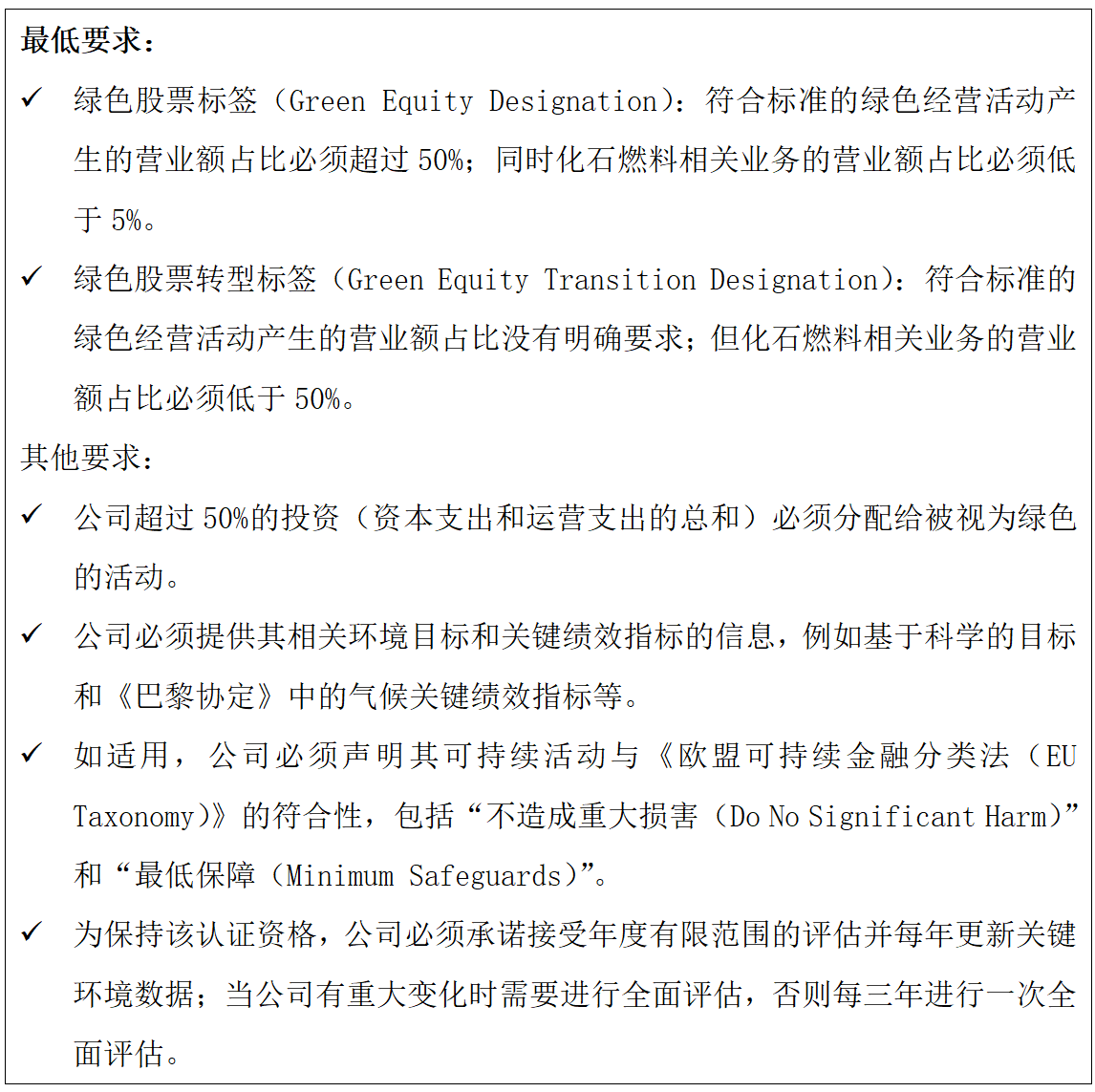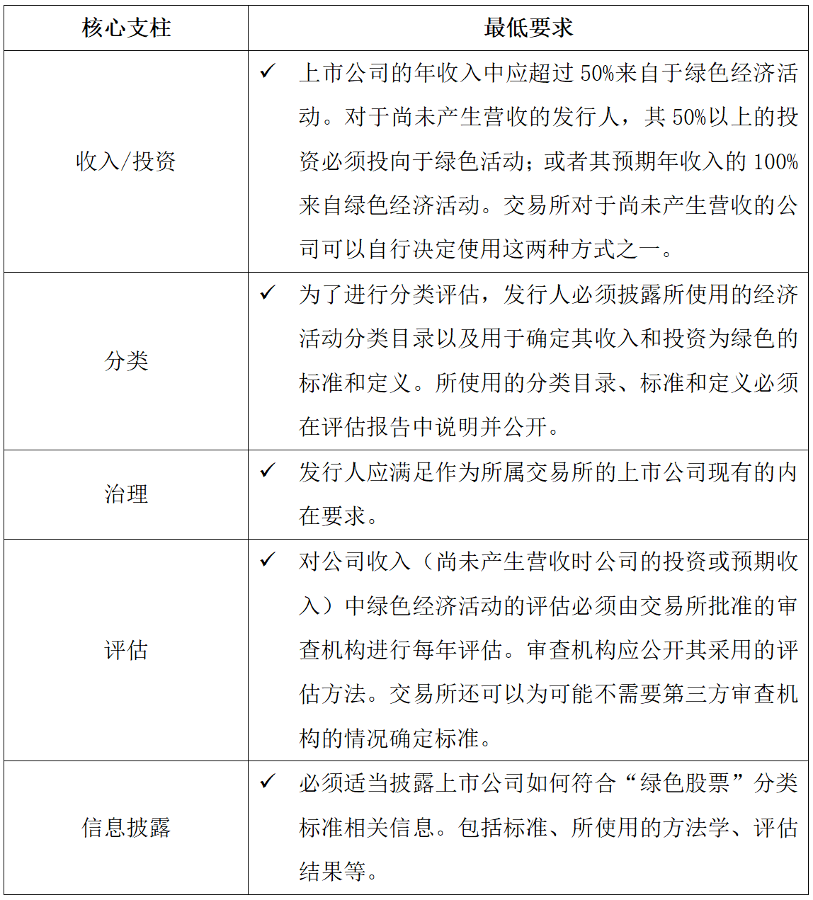 進(jìn)入2023年,國際上關(guān)于綠色股票的討論逐漸走向框架性與標準化。2023年3月,世界交易所聯(lián)合會(huì )(World Federal of Exchange, WFE)發(fā)布了《世界交易所聯(lián)合會(huì )綠色股票原則(The WFE Green Equity Principles)》,這是首個(gè)可供各交易所識別綠色股票的全球框架。根據該原則,綠色股票為主要從事或投資于綠色經(jīng)濟活動(dòng)的公司發(fā)行的股票;其中,綠色股票發(fā)行公司的綠色經(jīng)濟活動(dòng)在主營(yíng)業(yè)務(wù)收入和投資占比均需為50%以上,并同時(shí)滿(mǎn)足投資于化石燃料比例低于5%的要求。該框架基于收入/投資(Revenues/investments)、分類(lèi)(Taxonomy)、治理(Governance)、評估(Assessment)、披露(Disclosure)五大支柱構建,增加了綠色定義的透明度、清晰度、一致性和客觀(guān)性,有助于抵制“漂綠”行為并支持更多資金流向可持續領(lǐng)域。同時(shí),通過(guò)采用國際公認的最佳實(shí)踐,該框架通過(guò)促進(jìn)協(xié)調統一幫助強化了不同司法管轄區之間的可比性,營(yíng)造了更為公平的市場(chǎng)環(huán)境,吸引了更多企業(yè)與投資者參與。