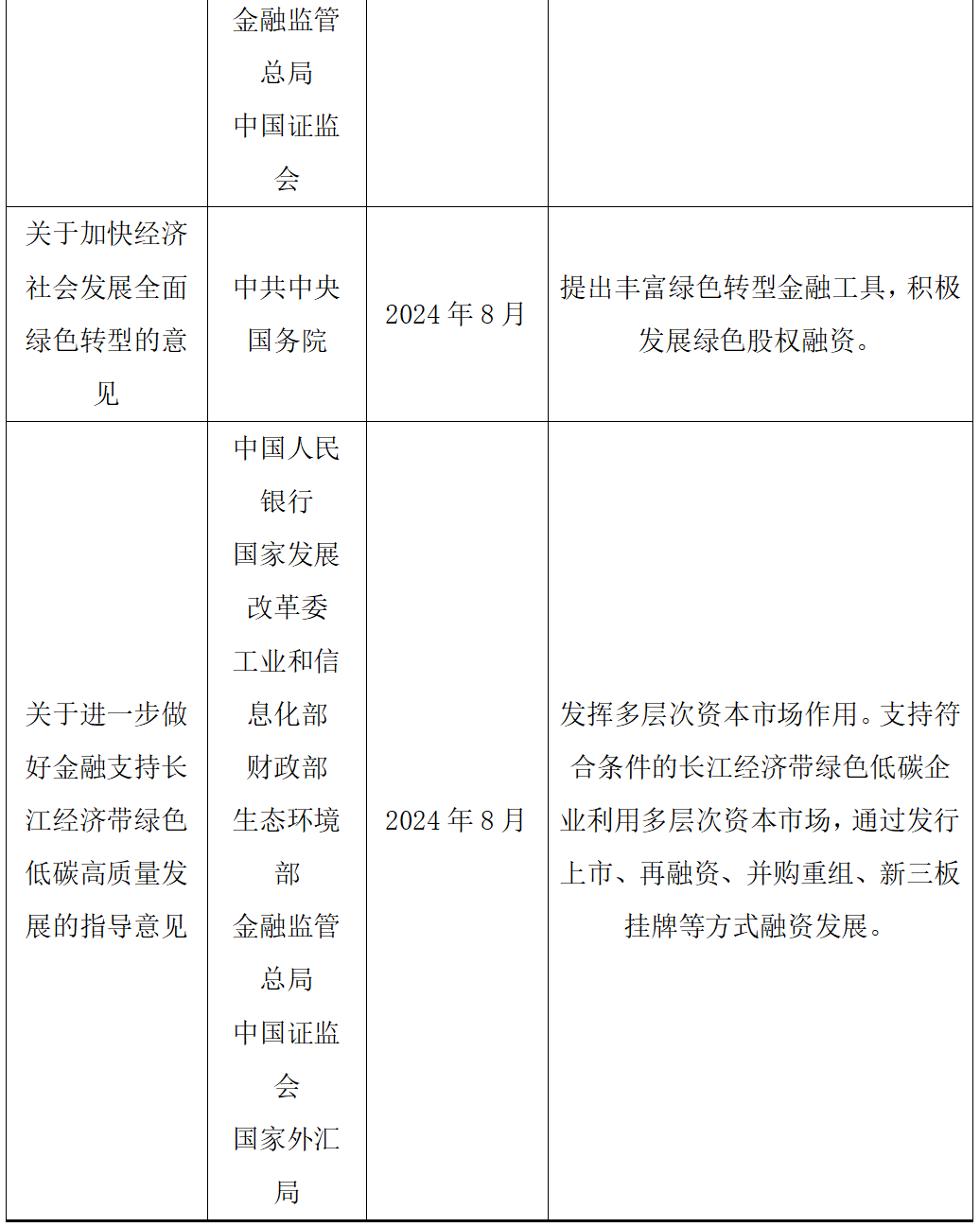 2024年,我國在綠色股票領(lǐng)域的政策支持力度顯著(zhù)增強,呈現出系統推進(jìn)、多層發(fā)力的鮮明特征。3月,中國人民銀行等七部委聯(lián)合印發(fā)《關(guān)于進(jìn)一步強化金融支持綠色低碳發(fā)展的指導意見(jiàn)》,首次明確提出“研究制定綠色股票標準,統一綠色股票業(yè)務(wù)規則”,并強調“進(jìn)一步加大資本市場(chǎng)支持綠色低碳發(fā)展力度,支持符合條件的企業(yè)在境內外上市融資或再融資,募集資金用于綠色低碳項目建設運營(yíng)”。該文件從國家層面首次對綠色股票市場(chǎng)的框架體系與業(yè)務(wù)規則作出明確部署,標志著(zhù)綠色股票制度構建進(jìn)入實(shí)質(zhì)性推進(jìn)階段。8月,中共中央、國務(wù)院發(fā)布《關(guān)于加快經(jīng)濟社會(huì )發(fā)展全面綠色轉型的意見(jiàn)》,提出“豐富綠色轉型金融工具,積極發(fā)展綠色股權融資”,將綠色股權融資納入經(jīng)濟社會(huì )全面綠色轉型的整體布局。同月,在《關(guān)于進(jìn)一步做好金融支持長(cháng)江經(jīng)濟帶綠色低碳高質(zhì)量發(fā)展的指導意見(jiàn)》中,進(jìn)一步明確“支持符合條件的長(cháng)江經(jīng)濟帶綠色低碳企業(yè)利用多層次資本市場(chǎng),通過(guò)發(fā)行上市、再融資、并購重組、新三板掛牌等方式融資發(fā)展”。一系列政策密集出臺,表明綠色股票已成為國家綠色金融體系建設的重要組成部分,正在獲得持續且明確的政策引導與支持。