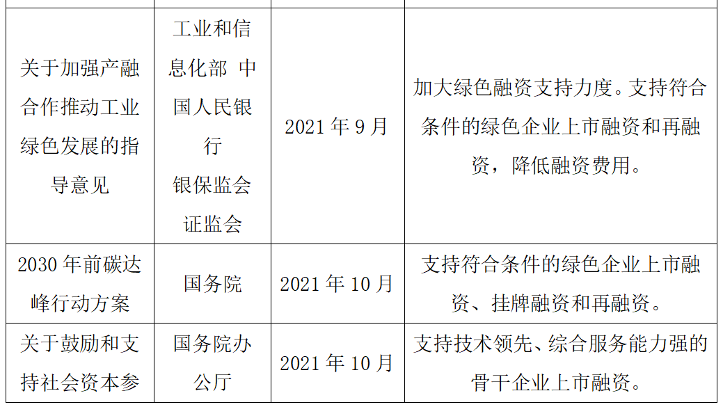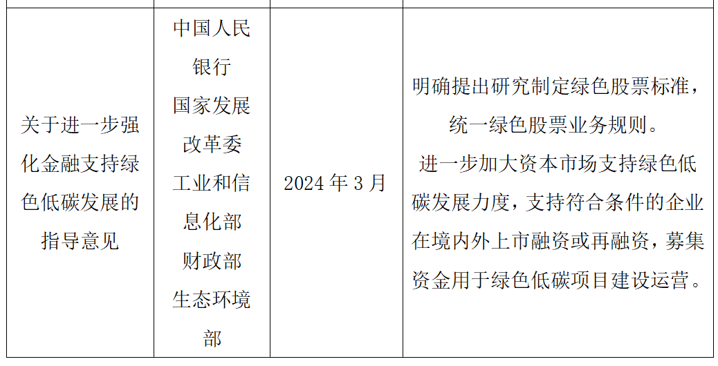 雖然我國尚未正式提出“綠色股票”的定義與標準,相關(guān)專(zhuān)項政策也尚未落地,但一直以來(lái),對于綠色企業(yè)在股票市場(chǎng)上市融資和再融資的政策支持一直貫穿于我國一系列綠色金融政策制度中。早在2016年,我國綠色金融頂層設計文件《構建綠色金融體系的指導意見(jiàn)》中便提出“積極支持符合條件的綠色企業(yè)上市融資和再融資。在符合發(fā)行上市相應法律法規、政策的前提下,積極支持符合條件的綠色企業(yè)按照法定程序發(fā)行上市。支持已上市綠色企業(yè)通過(guò)增發(fā)等方式進(jìn)行再融資”。2021年以來(lái),國務(wù)院發(fā)布的《關(guān)于加快建立健全綠色低碳循環(huán)發(fā)展經(jīng)濟體系的指導意見(jiàn)》《2030年前碳達峰行動(dòng)方案》《關(guān)于完整準確全面貫徹新發(fā)展理念做好碳達峰碳中和工作的意見(jiàn)》等文件中均強調了支持符合條件的綠色企業(yè)上市融資、掛牌融資和再融資的重要性。除了頂層文件的支持引導,隨著(zhù)《綠色債券支持項目目錄(2021年版)》《綠色低碳轉型產(chǎn)業(yè)指導目錄(2024年版)》等一系列綠色金融及綠色產(chǎn)業(yè)支持目標的構建,綠色業(yè)務(wù)活動(dòng)、綠色項目的符合范圍逐漸明晰,也為后續綠色股票的標準及目錄的制定提供了重要的技術(shù)積累和實(shí)踐參考。
